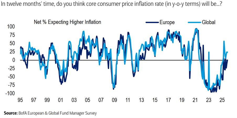 The picture for inflation has moved slightly higher with nearly a quarter (24%) of global investors surveyed expecting higher core inflation globally over the coming twelve months, unchanged from the results in the previous month, while none now expect lower core inflation in Europe down from 11% last month.