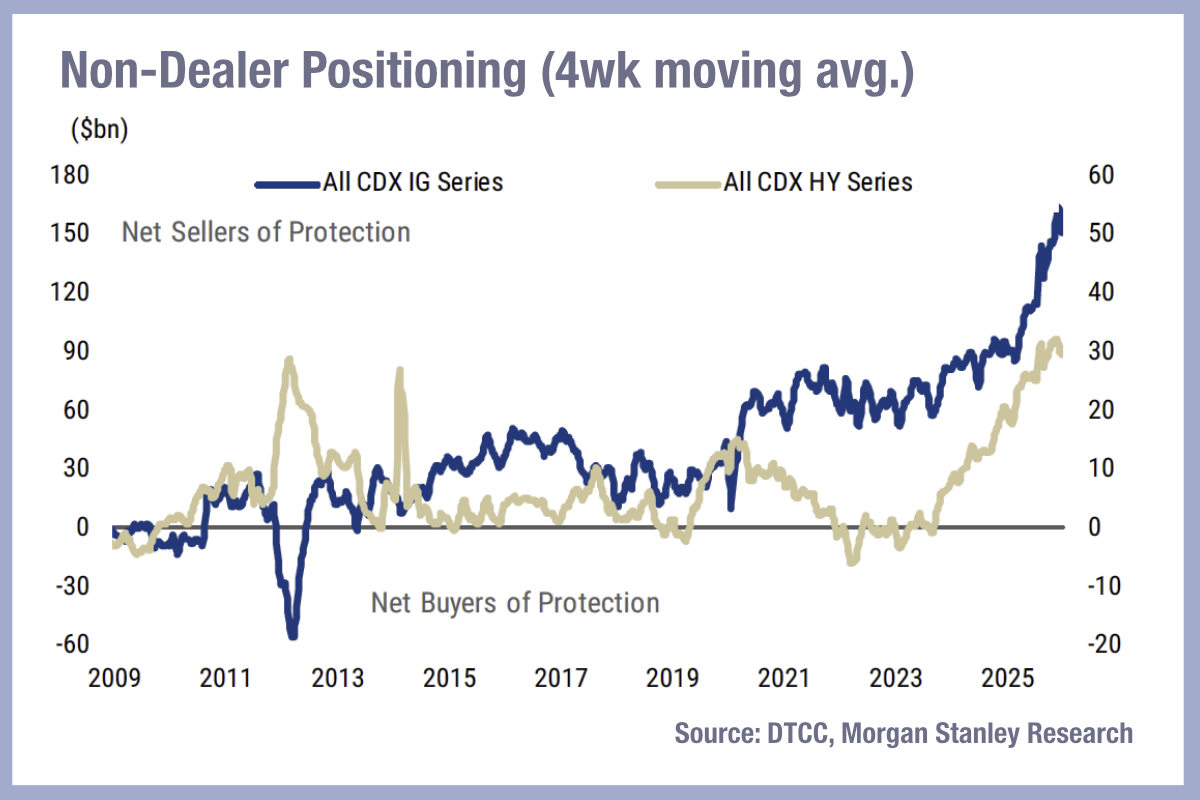 “Spreads continued to widen across CDS indices, with CDX IG and iTraxx Main ending the week 2bp and 6bp wider, respectively,” noted Morgan Stanley analysts, “Implied volatility rose for the fifth straight week. DTCC data as of 27 February suggest[ed] that net positioning in CDX IG and HY moderated in February from January’s record long, while Main and XO saw a further build-up in protection buying over the week.”