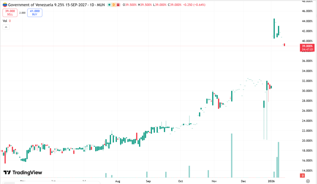 Prices on Venezuela’s benchmark notes due in 2026 have doubled since summer, with the 2027 9.25 government bond listed on the Munich Stock Exchange hitting 39% of par in 2026, up from 20% of par in July 2025.