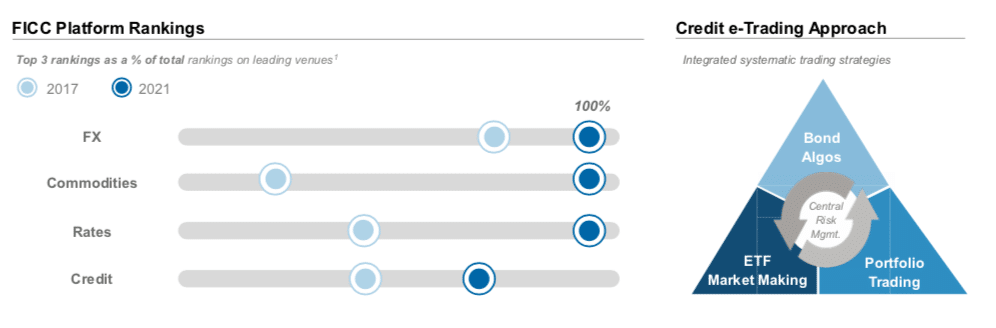 The investments have been in infrastructure to provide common technology platforms which helps the bank scale faster than peers; workflow automation which improves algos through structured datasets; organisational agility which allows more effective coverage of clients with data-driven decision making; and to drive market structure evolution with participation on third-party venues and the use of standard APIs for direct connectivity.