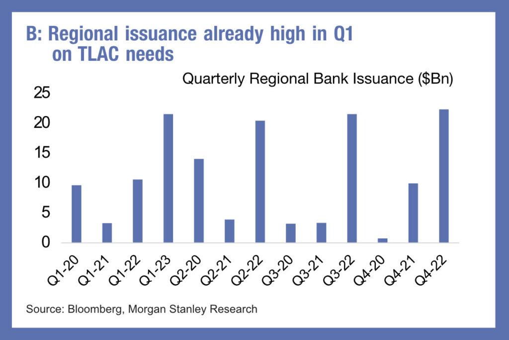 Bank bond issuance is expected to pick up this year according to research by Morgan Stanley analysts. With deposits proving less attractive as a source of funding, the MS team can see a path for larger sized banks to begin returning to markets as a source of funding.