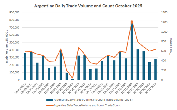 In October, average daily volume (ADV) of Argentinian bonds on MarketAxess hit US$307 million, an increase of 41% year-to-date ADV of US$217 million.