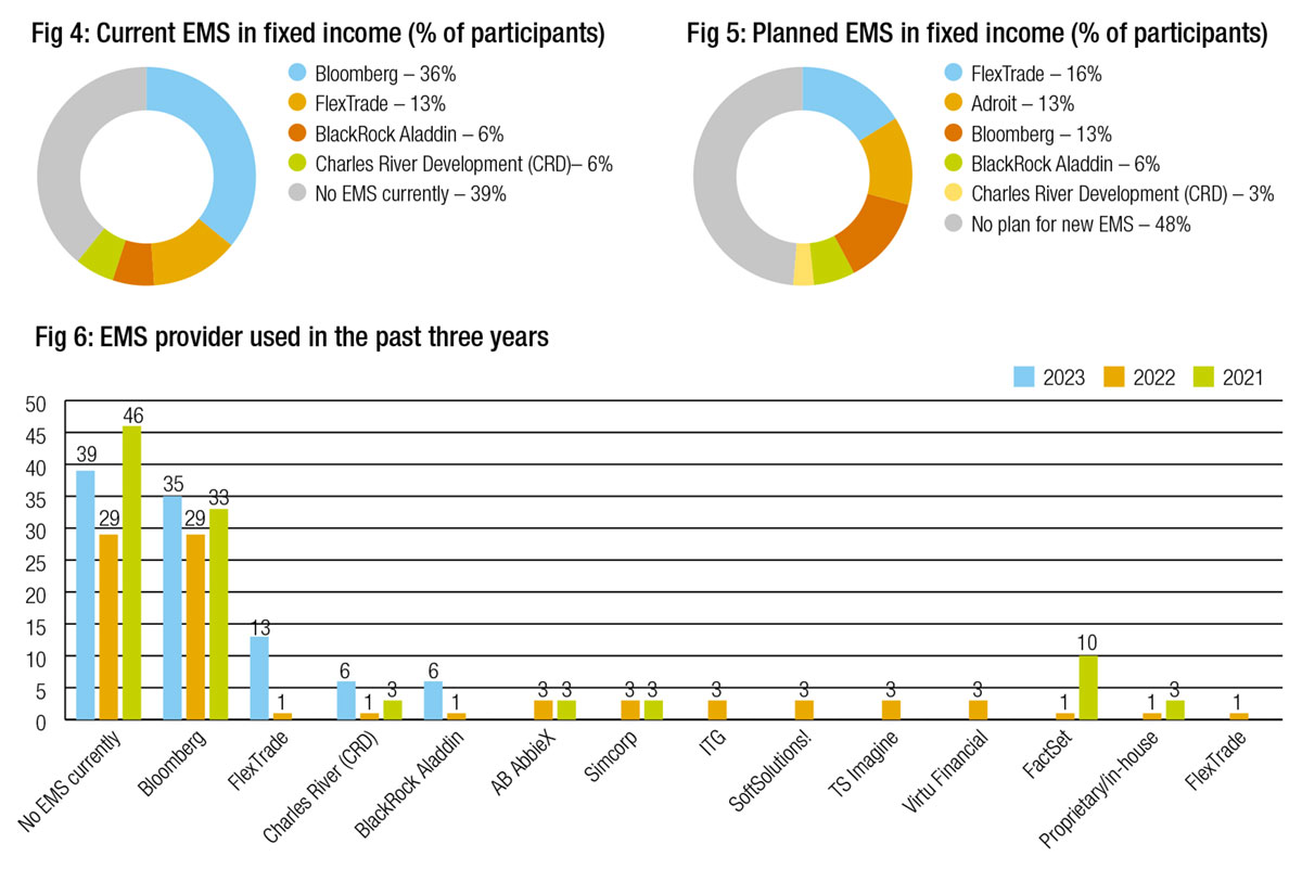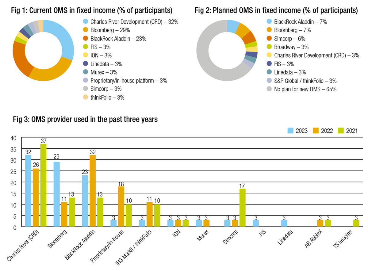 The latest survey into use of execution and order management systems by buy-side fixed income traders has shown a solid base for the major OMS providers, including Charles River, Bloomberg and BlackRock Aladdin, with few competitors emerging to threaten the big three (see Fig 1).