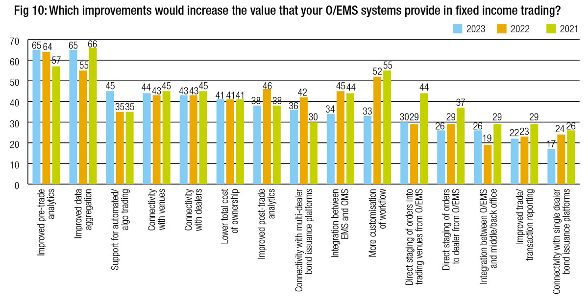 While improved data in fixed income markets is a perennial issue for TCA systems, pre-trade analytics is the main additional service that could deliver improvement to O/EMS functionality followed by improved data aggregation (see Fig 10).