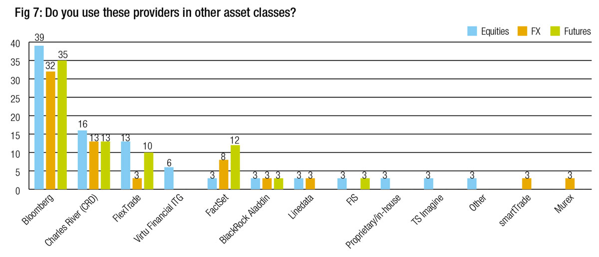 The cross asset space is dominated by Bloomberg, which has the lead in common use across equities, FX and futures, yet many other firms are clearly also getting traction by supporting multi-asset trading, including Charles River, FlexTrade and FactSet (see Fig 7).