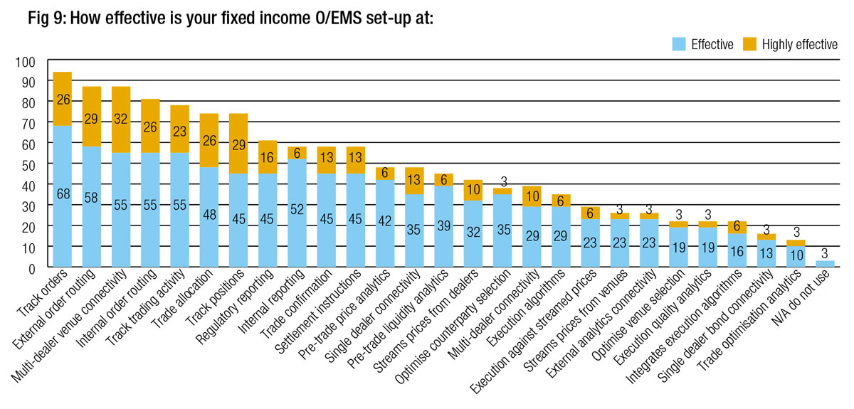 Overall, traders report that their O/EMS set ups are most effective at routing orders both internally and externally, tracking of orders, trade positions and trading activity, as well as supporting trade allocation and connectivity to multi-dealer trading venues (see Fig 9). This is in line with the functionality reported in previous years. We have seen some relatively big changes in function, with tracking of positions, trades and orders all increasing in effectiveness by double figures over the past year, while connectivity to multi-dealer venues also got a boost.