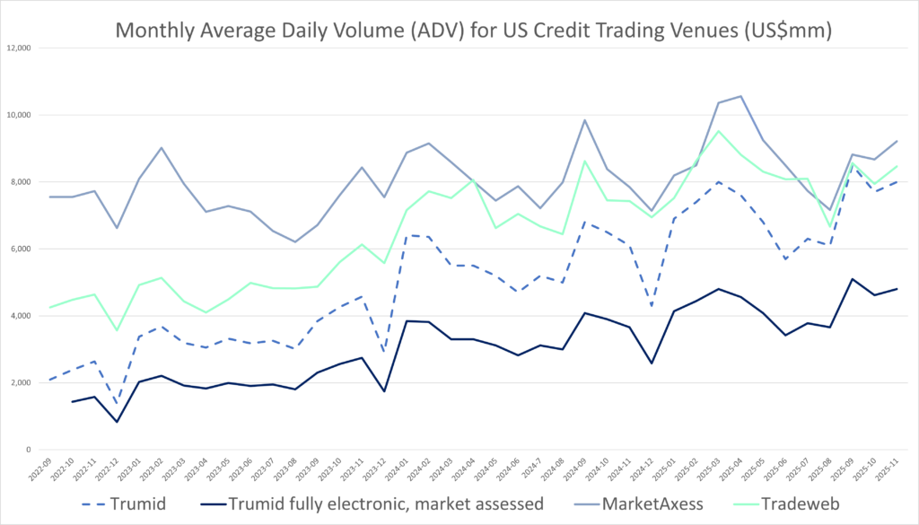 Trumid reported November ADV was US$8 billion, up 32% YoY, with list-based protocol volumes doubling YoY and RFQ participation at new highs. The firm highlighted continued automation via AutoPilot and strength in high yield, where HY ADV rose 38% YoY.