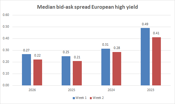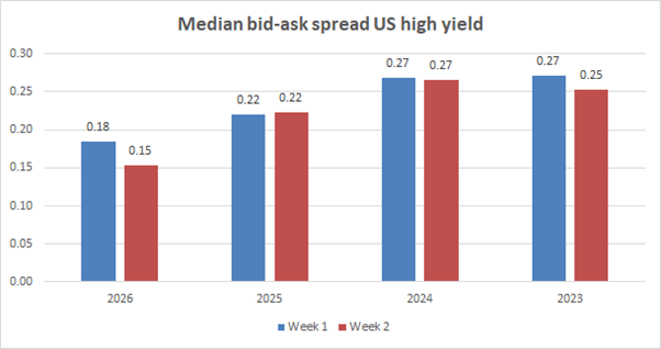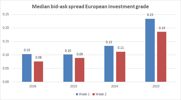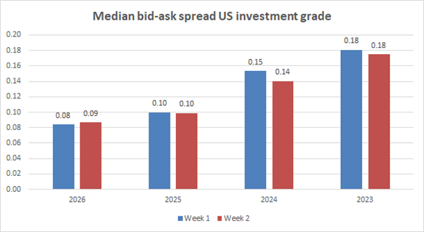 In US markets the average bid-ask spreads in IG have been sub 0.10 basis points (bps) for the first year on record, falling below half of that seen in 2023, and while this is only slightly lower than those seen in 2025, the fact that there is room for further compression is surprising in itself.